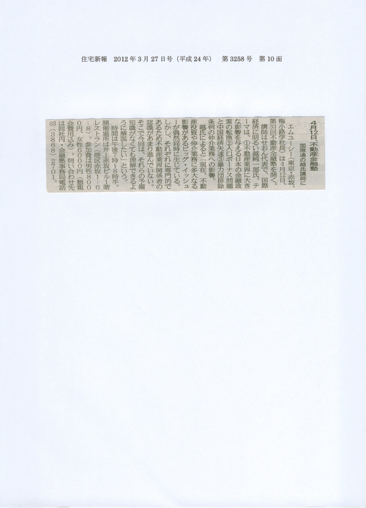 「住宅新報(2012年3月27日号 第10面)」当社記事