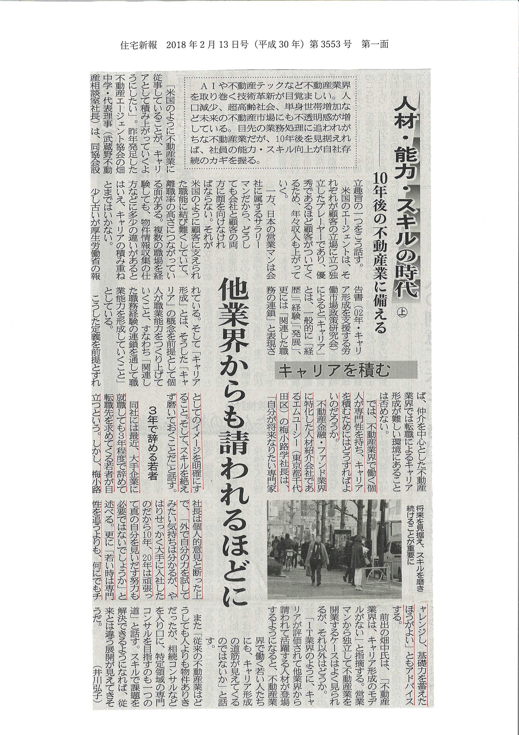 「住宅新報 2018年2月13日 第3553号」当社インタビュー記事