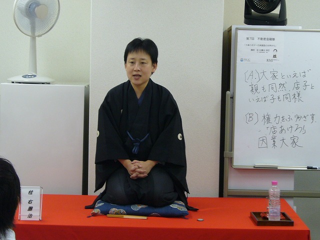 第7回不動産金融塾は、(社)落語芸術協会 初の女性真打 桂右團治師匠をお招きして、「大家と店子~古典落語の世界から」というテーマでお話いただきました。